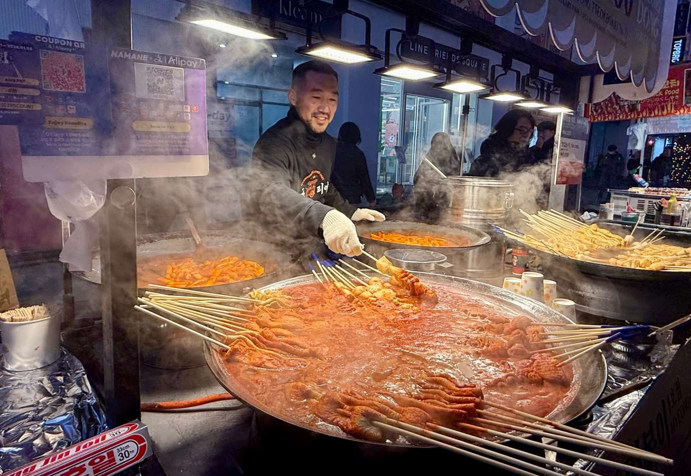 在韩国首尔的明洞商业区,每方土地都有“寸土寸金”的味道。街区的两旁是整齐的商铺,从阿迪达斯等国际品牌到韩国潮牌、美妆品牌等应有尽有,代表着韩国年轻一代的最新潮流。街区的步道上,同样有两排“商区”,是密密麻麻的小摊,冒着各类小吃的热气。