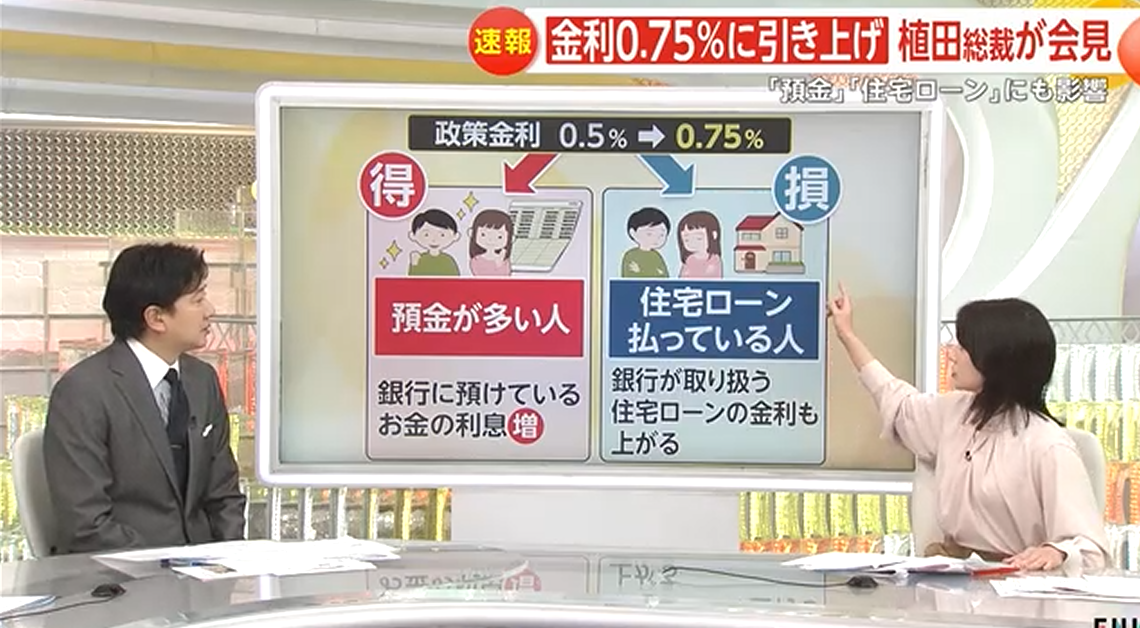 (亚太快讯消息)日本央行决定追加加息,将政策利率上调至0.75%,达到约30年来的最高水平。富士电视台分析指出,此举将对日本民众生活产生明显影响,且不同人群得失不一。