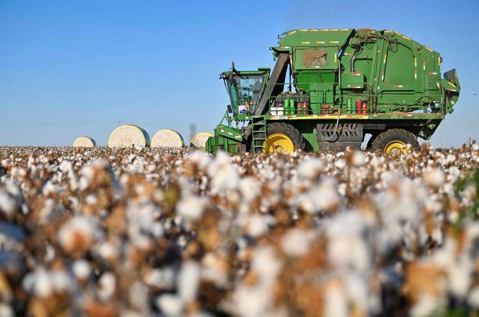 资料图:采棉机在新疆的棉田采收棉花。(图/新华社)