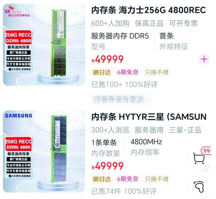 据近日报道,第三方购物平台上,海力士和三星的256G DDR5服务器内存单根价格已超4万元(人民币,下同),部分甚至高达49999元/根。如果按照1盒100根来计算,总价格将近500万元,有业内人士形容称“价值已经超过上海不少房产”。