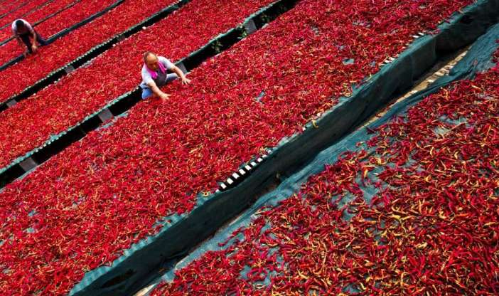 图为鸡泽县椒农在晒辣椒。(图/中新社微信公众号)