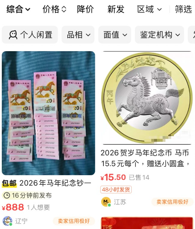 线上预约额度迅速售罄,也直接推高了二手交易市场的活跃度。在部分交易平台,马年贺岁纪念币、纪念钞在兑换期内便已出现明显溢价。