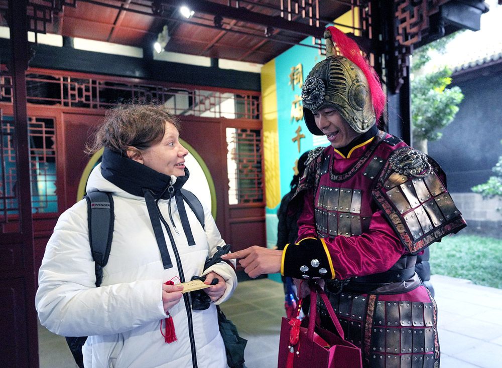 今年元旦假期期间,四川成都武侯祠博物馆及锦里特色街区吸引民众前去参观游览。图为武侯祠博物馆身着铠甲的“士兵”为外国游客赠送“丞相锦囊”。(图/中新社)