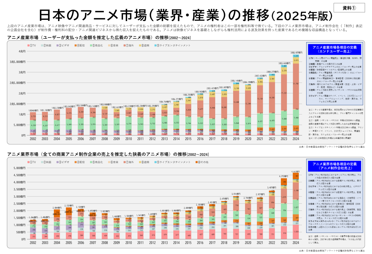 日本动画协会于4日向公众发布了《动画产业报告2025》摘要版。数据显示,2024年全年动画产业市场规模达到3.8407万亿日元,较上一年增长114.8%,创下历史新高。