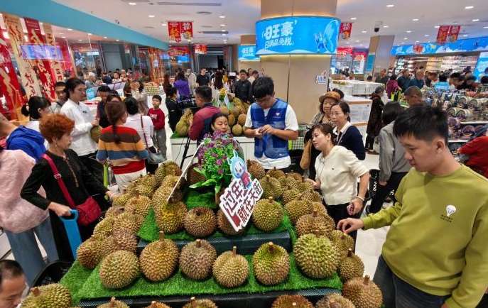图为在海口市旺豪日用消费品免税店,消费者正在购买马来西亚榴莲。(图/中新网)