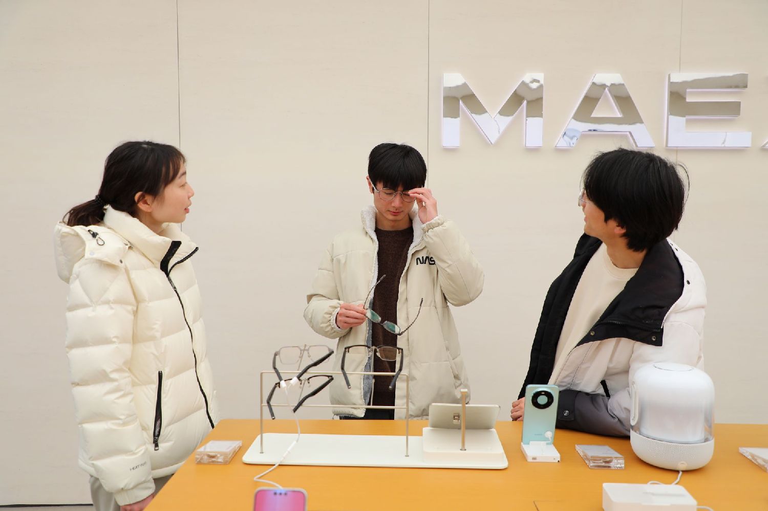2月17日,在重庆光环购物公园某商店内,顾客正在试戴AI眼镜。(图/中新社)