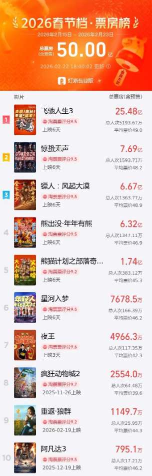 2026年中国春节档电影总票房(含预售)突破50亿元人民币。(图/灯塔专业版)