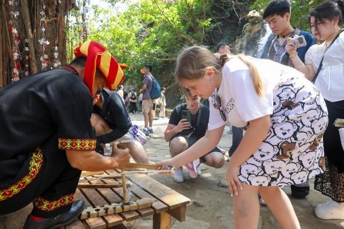 海南槟榔谷黎苗文化旅游区则是一派浓郁的民族风情。游客穿梭古村小巷,舂年糕、品竹筒饭,聆听儋州调声。景区每日准备300场次NPC互动及演艺,让游客在体验黎族钻木取火、顶杠等项目中,感受地道海南年味。