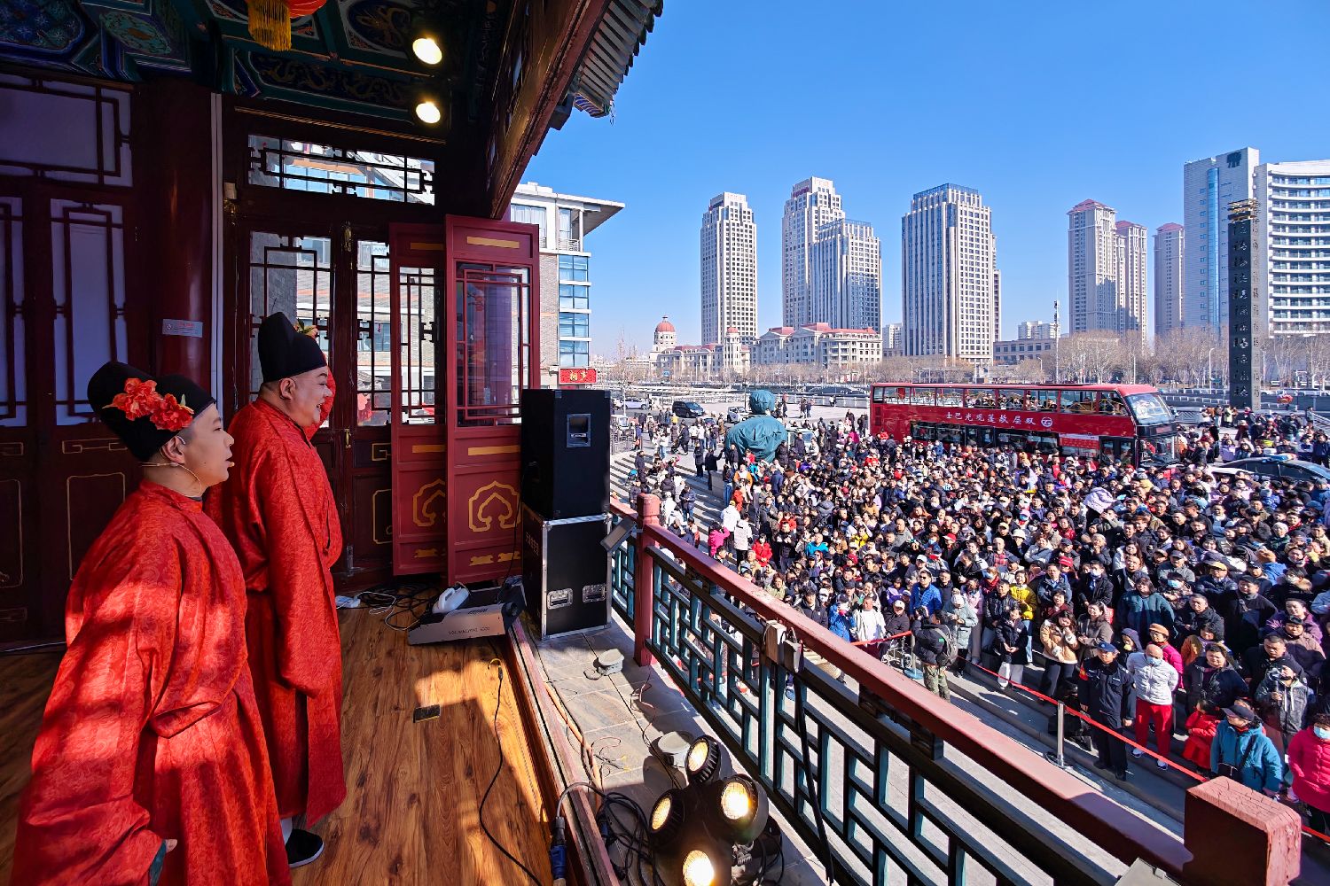 资料图:春节期间,游客在天津古文化街观看演出。(图/中新社)