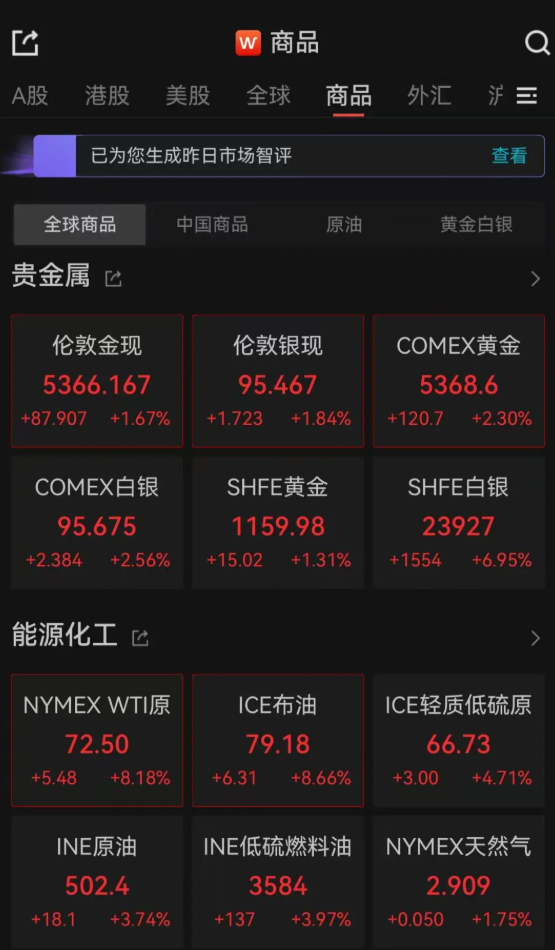 3月2日,国际油价、金价开盘大幅上涨,布油涨13%,报81.57美元/桶,美油涨11%,报75美元/桶;COMEX黄金涨近3%,逼近5400美元/盎司关口,现货黄金涨超1%。