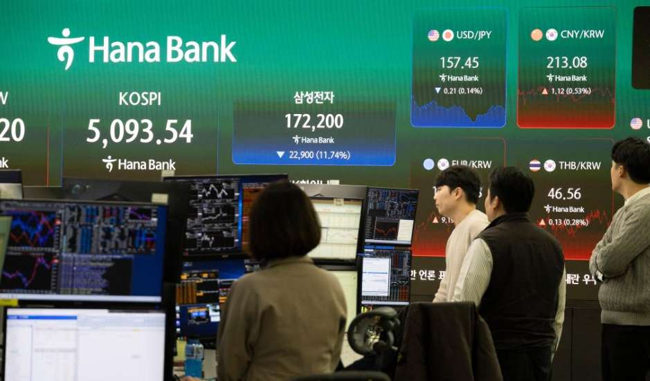 3月4日,银行职员在韩国首尔一家银行的股指大屏前工作。(图/新华社)
