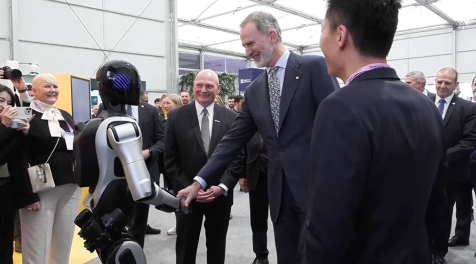 当地时间3月2日,世界移动通信大会(MWC)首日,西班牙国王费利佩六世在参观未来机场展厅时,中国具身智能领军企业智元机器人(AGIBOT)产品“远征A2”化身智能向导,全程流畅引导并讲解,陪同国王完整参观展厅,这一互动成为现场焦点。图为人机互动现场。(图/上海上观新闻)