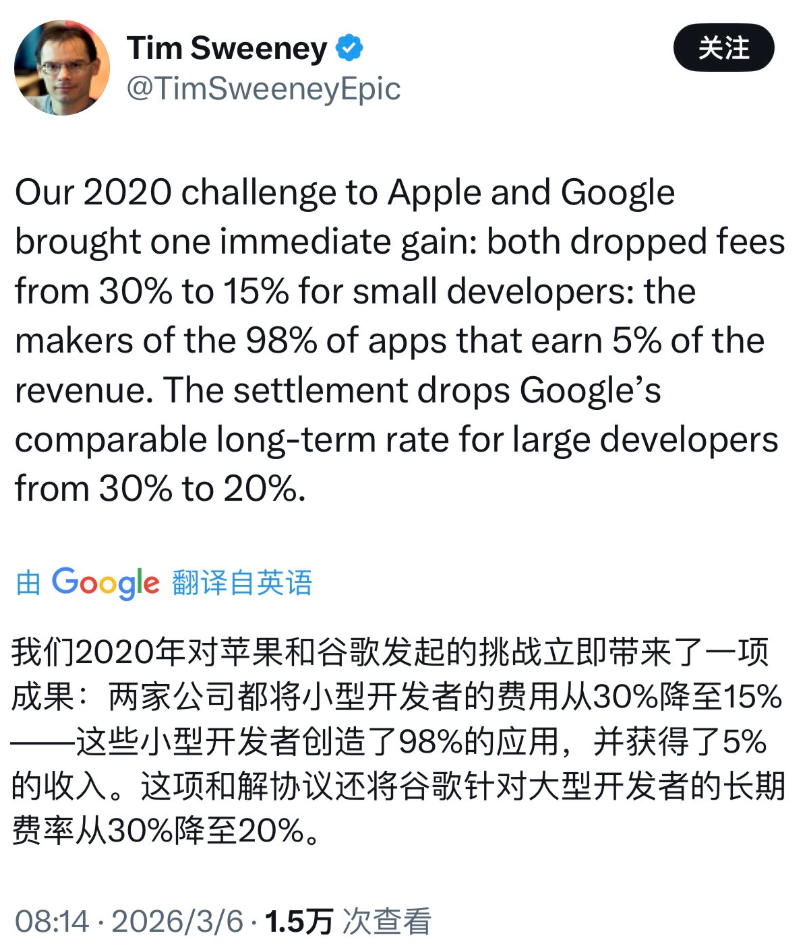 Epic Games首席执行官蒂姆·斯威尼(Tim Sweeney)在近日发文盛赞谷歌的调整方案,称谷歌在全面开放安卓系统,并表示已经彻底解决了与谷歌的纠纷。
