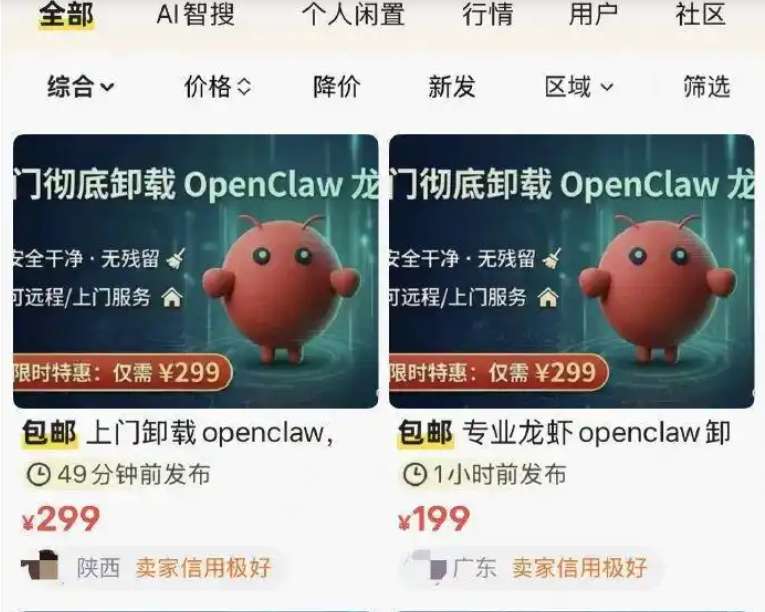 3月10日,中国某交易平台上已出现代卸载OpenClaw的服务。一名IP地址显示在上海的商家报价,上门卸载OpenClaw(仅限在上海)收费299元(人民币,下同),远程卸载OpenClaw收费199元,并称“安全彻底,无残留”。
