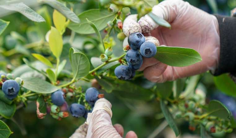 资料图:工人在蓝莓生产基地采摘蓝莓。(图/新华社)