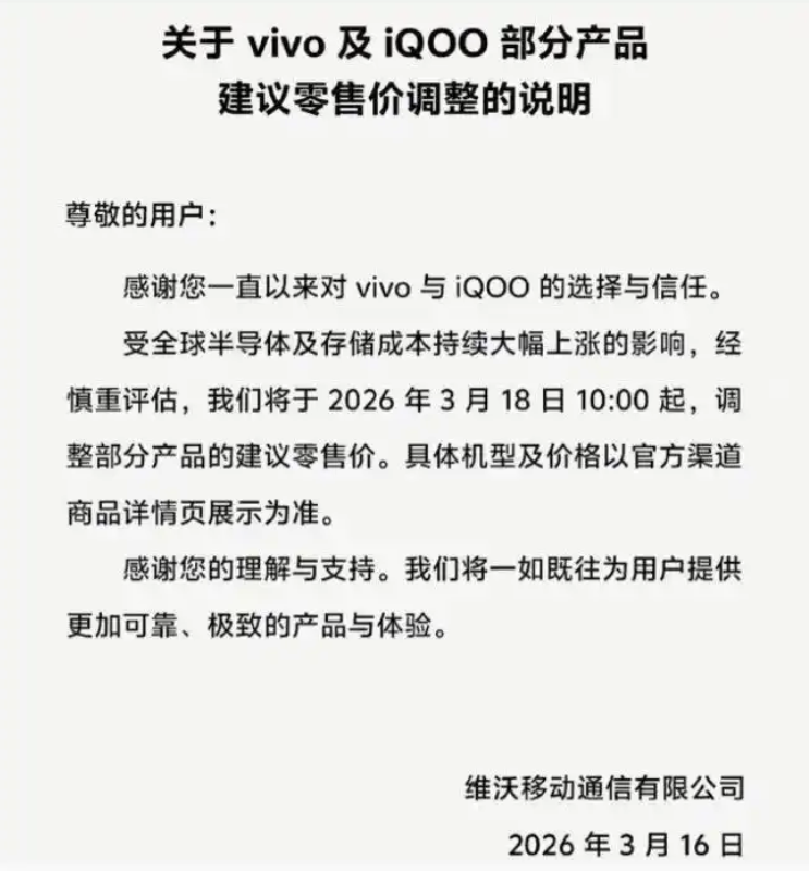 当地时间3月16日上午,vivo在官网发布零售价格调整声明。vivo表示,“受全球半导体及存储成本持续大幅上涨影响,经审慎评估,将于3月18日10时起,调整部分产品建议零售价。”受存储涨价影响,中国手机市场正迎来近5年来规模最大的一轮集体涨价潮。