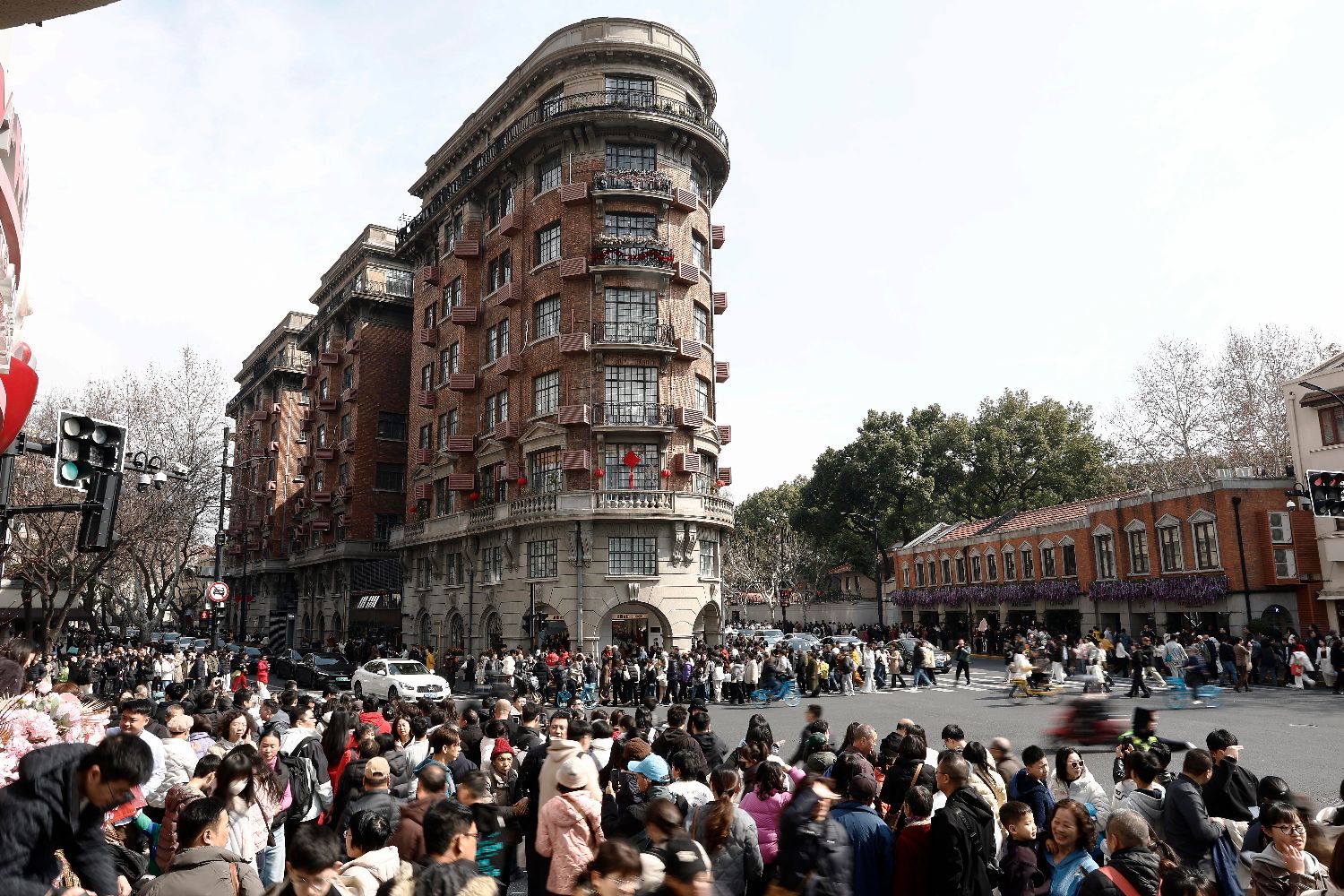 2月19日,武康大楼吸引游客。春节假期期间,上海市主要道路、商圈、交通枢纽纷纷披上节日盛装,灯笼高挂,鲜花盛开。马年元素与传统中国元素巧妙融合,以花为媒,将新春氛围拉满。(图/中新社)
