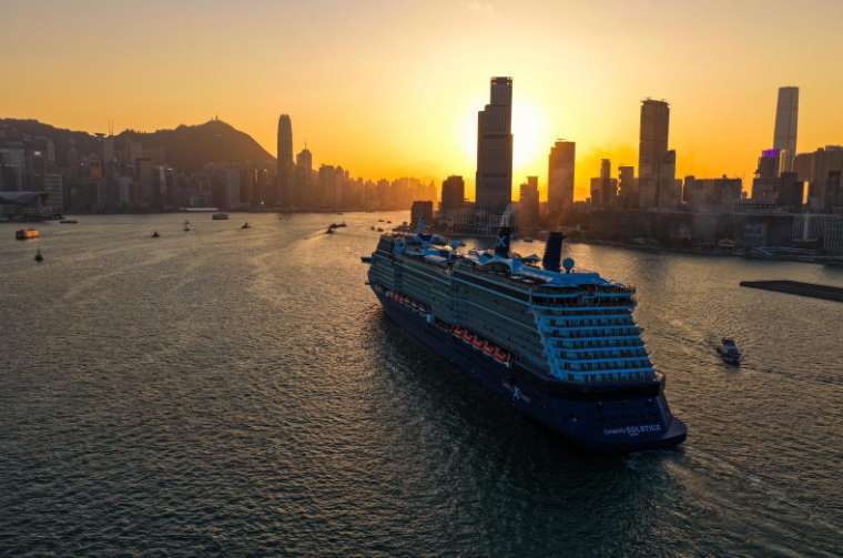 3月14日,“名人极致号”邮轮经过维多利亚港。(图/中新社)