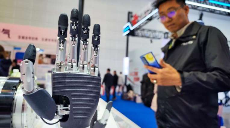 3月18日,天津,观众参观灵巧手机器人设备。(图/中新社)