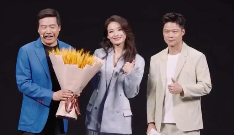 布新一代小米SU7代言人舒淇(中)和苏炳添(右)现身发布会现场,送雷军(左)大麦,寓意“大卖”。(图/上海《新民晚报》)