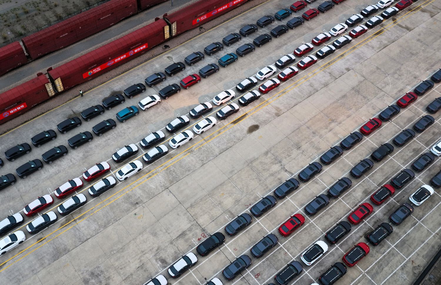 3月23日,航拍宁德陆港(铁路专用线)内等待装载出口的新能源车。(图/中新社)