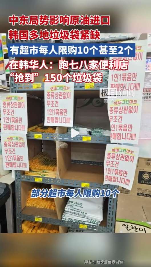 有在首尔的华人网民表示,凌晨跑遍三家便利店均未买到垃圾袋。由于当地实行严格的分区垃圾袋规定,跨区购买不可行,而她家中仅剩一个垃圾袋,违规丢弃将面临罚款。另有华人透露,部分超市已实施限购,有的每人限购1捆(10个),有的甚至限购2个。
