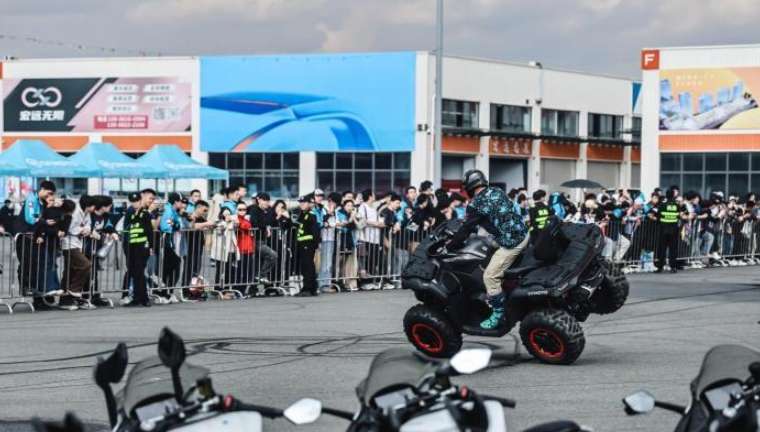 图为“CFMOTO DAY 2026”活动现场,车手驾驶全地形车进行特技表演,吸引众多车友驻足围观。(图/中新网)
