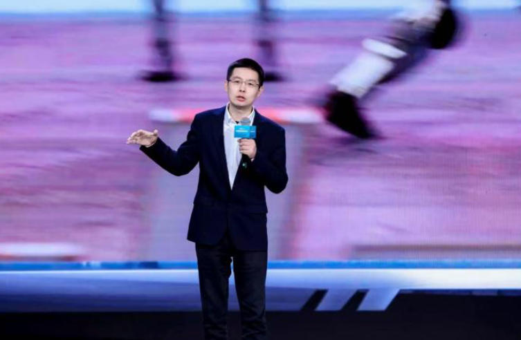图为宇树科技创始人王兴兴在2026中国网络媒体论坛现场演讲。(图/中新网)