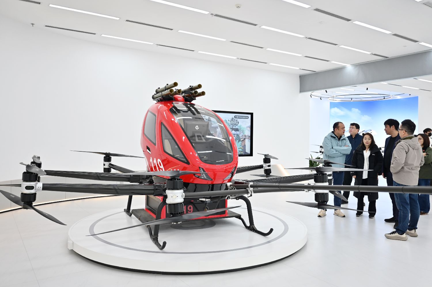 1月6日,“新春走基层”媒体调研行黄埔低空经济专场在广州市黄埔区开展。图为亿航智能的无人驾驶消防航空器EH216-F吸引参观者。(图/中新社)