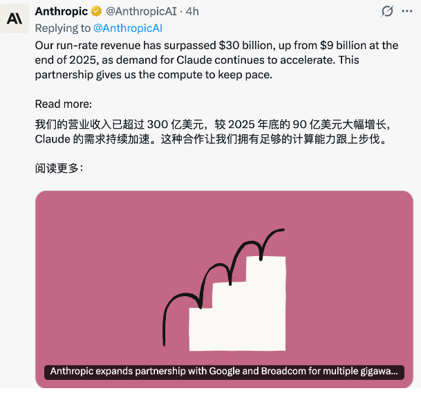 Anthropic对外公布公司年化收入超过300亿美元。(图/X截图)