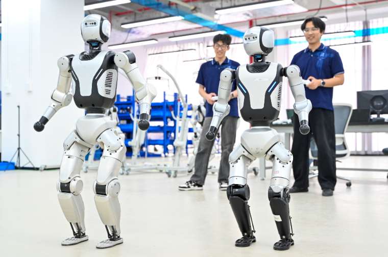 4月12日,乐聚机器人技术人员在中试产线调试人形机器人。(图/中新社)