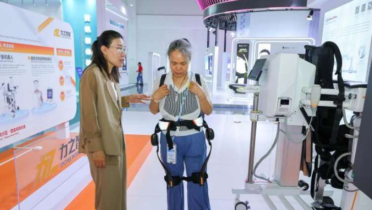4月15日,在第六届中国国际消费品博览会国际健康消费分展区,参观者在体验一款智能下肢康复外骨骼机器人。(图/中新网)