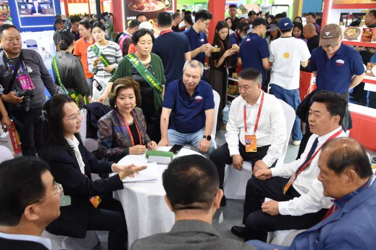 4月19日,第二十三届中国(漯河)食品博览会在河南漯河启幕。图为泰国客商正在和中方客户洽谈业务。(图/中新社)