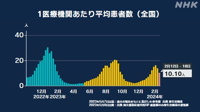 每家医疗机构的平均病例数为10.1例,是前一周的0.73倍。这是病例数连续第二周比前一周持续减少。