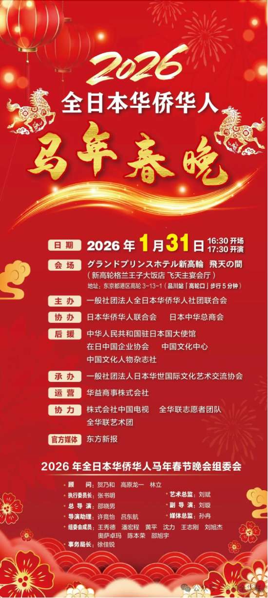 2026年1月31日,全日本华侨华人马年春晚将在东京都内的新高轮格兰王子大饭店“飞天主宴会厅”拉开帷幕。晚会诚邀各界嘉宾共襄盛举,共同传承中华文化,书写中日友好的新篇章。