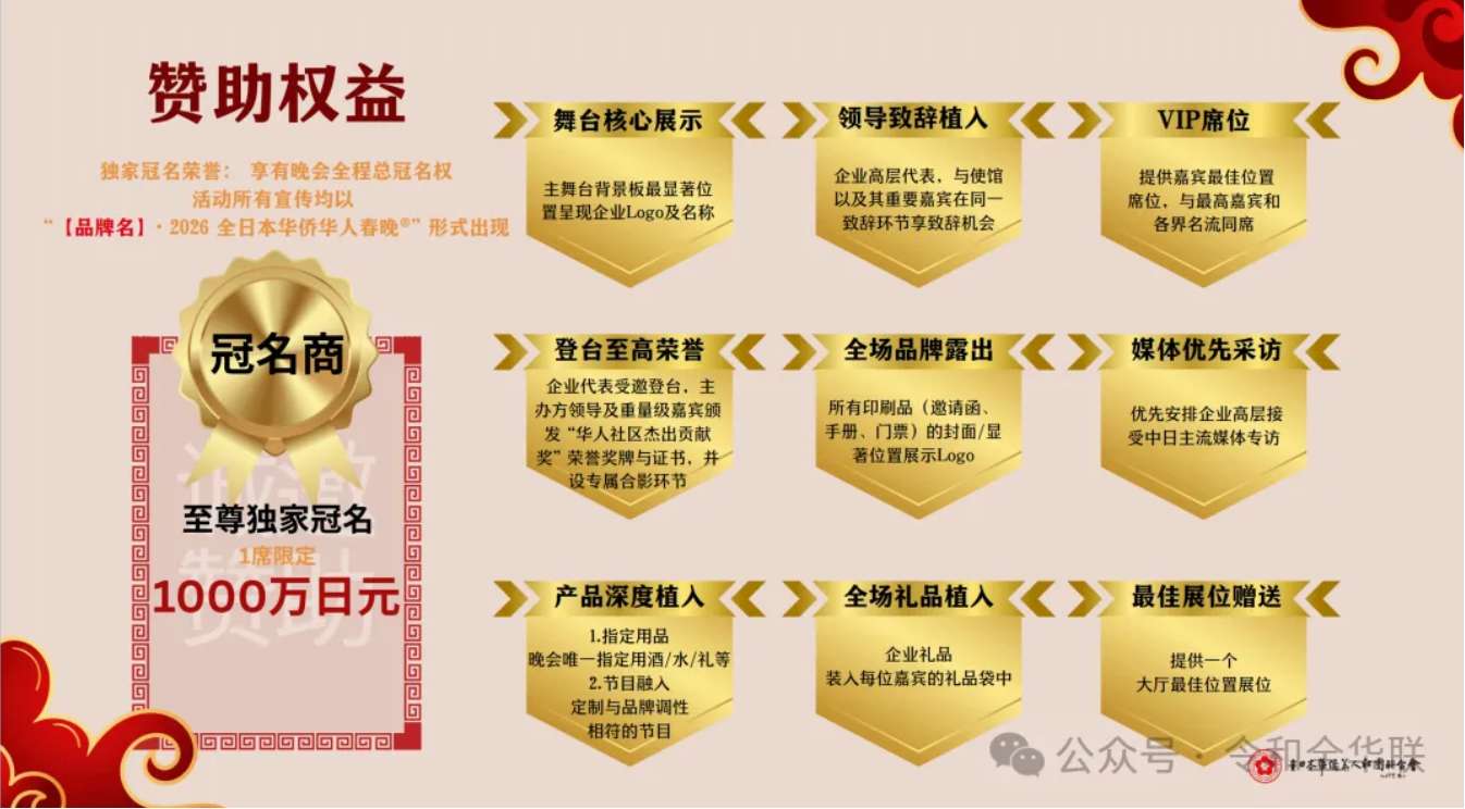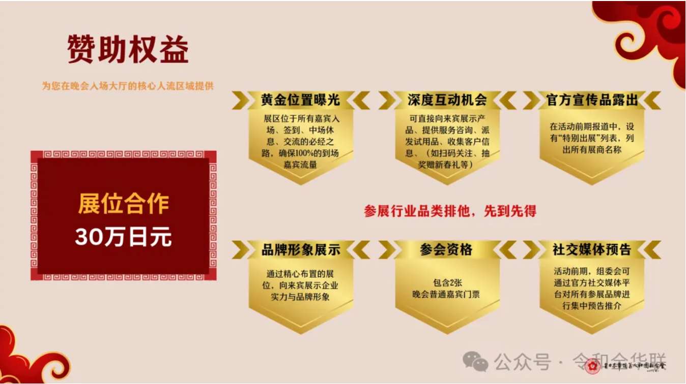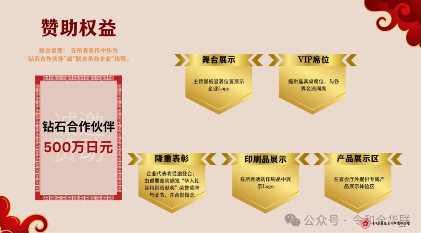对于有意支持的企业来说,参与全华联春晚,是一次融入在日华人核心社群的契机,更是一次与中日两国社会共享文化价值的合作。通过冠名支持、礼品定制或宴会协作等多种形式,企业能够在友好氛围中提升品牌认知度,与在日高端人群和中日商界建立更深层次的联系。