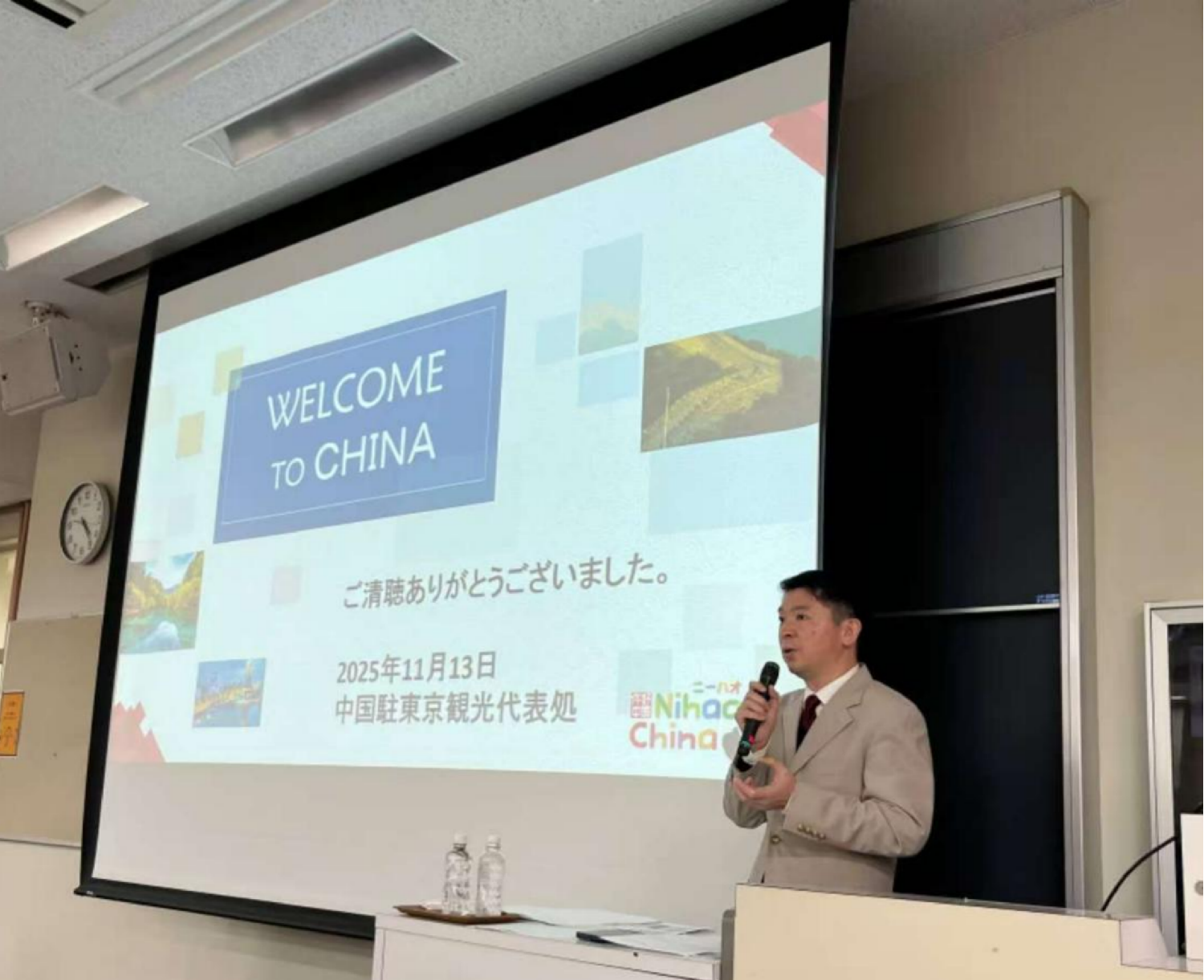 2025年11月13日,中国驻东京旅游办事处主任欧阳安应邀访问日本西武文理大学,并以“你好!中国”为主题举办中国文旅专题讲座。本次讲座以展示当代中国发展成就、推广中国文旅资源为核心内容,吸引了近200名师生踊跃参与。