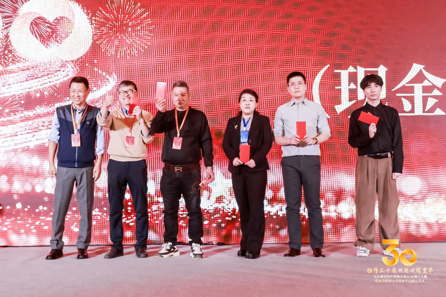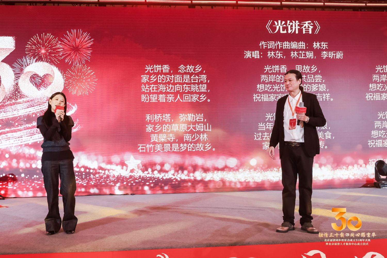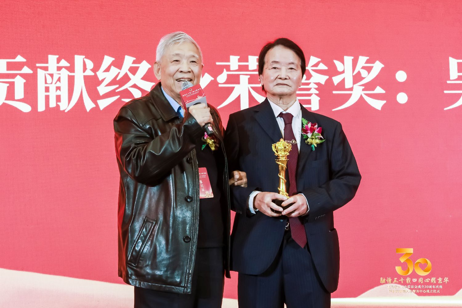 30周年庆典分下午场和晚场。下午场的第一场,主要是吴会长做工作报告。第二场除吴会长、执行会长郑尔平讲话与嘉宾致辞外,主要是为联谊会发展壮大做出突出贡献的韩国龙、林定强以及独家承办30周年庆典的陈立光颁奖;向吴会长、游德茂、余美琴、韩国建、刘大平以及新一届领导班子成员颁奖、授牌;向人才中心名誉主任、主任及专家组成员颁发奖牌和证书。