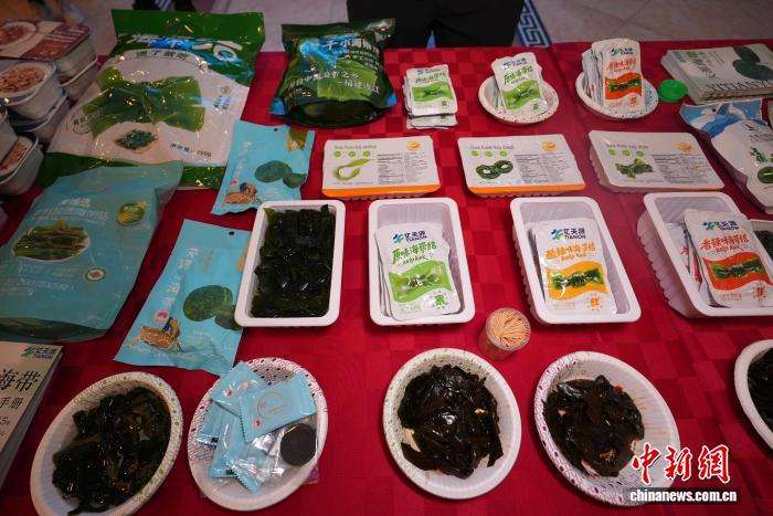 近日,“汇聚侨力·连通北美”美国连籍社团“海连江”品牌北美推介会在纽约举行,图为活动现场展示的连江海产品。(受访者供图)