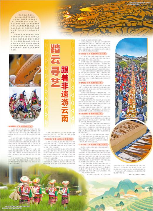 坡芽情歌·富宁非遗探索之旅带您领略壮族歌书文化的魅力;傣韵基诺情·西双版纳非遗体验之旅带您体验傣族与基诺族的文化风情;“非”游不可·大理苍洱毓秀非遗之美体验游带您深度感受白族文化的精髓;遇见丽江·古城寻遗之旅带您体验东巴纸制作、纳西古乐等纳西族传统文化;探寻“阿诗玛”·石林非遗体验之旅让彝族撒尼文化变得可听、可看、可体验。