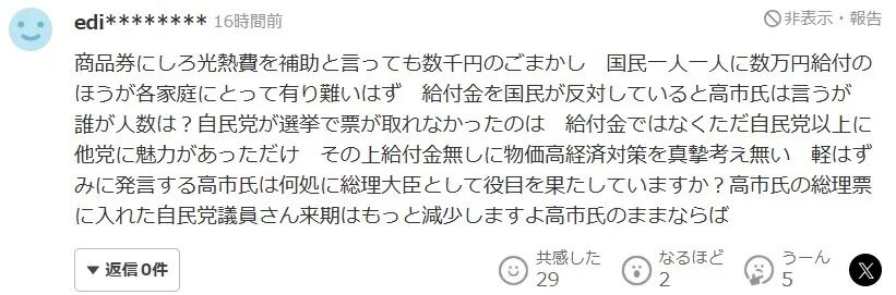 不管是商品券,还是所谓的水电燃气补助,几千日元的补贴都只是敷衍的手段而已。对国民来说,直接发放每人数万日元的补助金才真正有意义。高市说“国民反对发放补助金”,但请问到底是谁反对?……更何况,在不给补助金的情况下,高市对于物价高涨和经济对策也没有认真思考。她这种随意的发言方式,完全看不出作为首相应尽的责任在哪里……