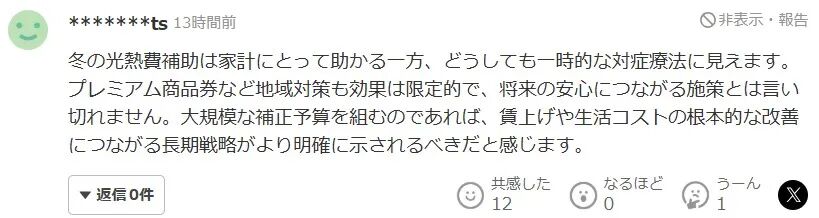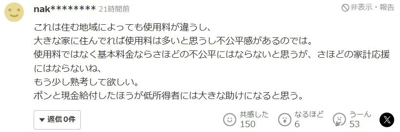 还有一个问题就是,这种补贴的公平性,令不少人质疑。因为日本的能源补贴是按使用量来减免,而不是按基本费用补助。换句话说,你家用得越多,补贴越多。如果住大房子,用电量、用气量本来就高,自然拿到的补助更多;而真正生活困难、住在小公寓、节约使用电气的人,反而拿不到多少钱。难怪很多日本网友都说,这完全偏离了补贴应该照顾弱势群体的初衷。
