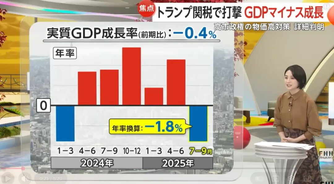 日本内阁府最新发布的2025年7-9月日本GDP速报显示,剔除通胀因素后,实际GDP环比下降了0.4%,按年增长率算,更是跌了1.8%。这是日本经济时隔六个季度再次陷入负增长。