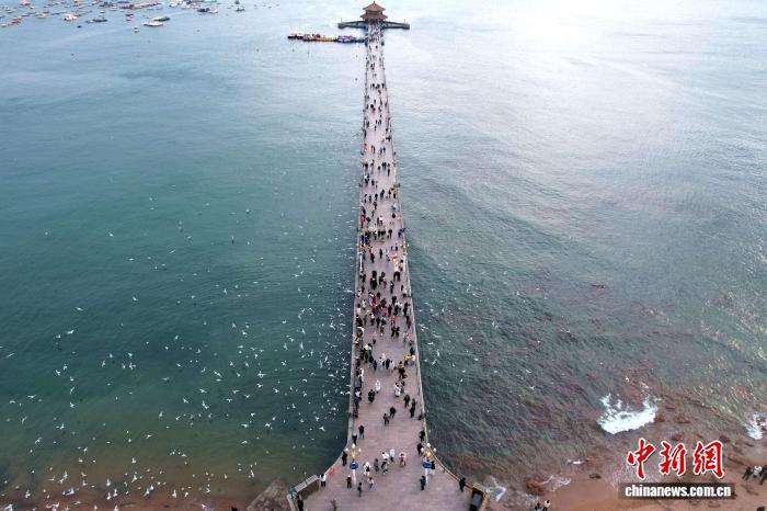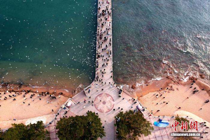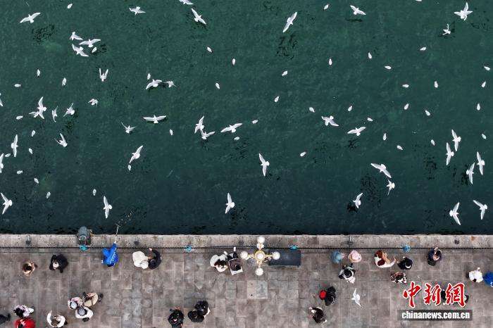12月2日,山东青岛,人与海鸥共赴的“年度之约”。成群的银鸥舒展双翼,在碧海蓝天间翩跹盘旋,时而低空掠过海面,时而停落肩头觅食,与前来打卡的市民游客近距离互动,让“人与海鸥和谐共处”成为这座滨海城市的初冬名片。(无人机照片)中新社发王鑫摄