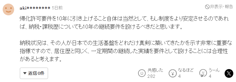 把归化许可的居住要求提高到10年本身是理所当然的,但如果真的想让制度更加稳定,我认为也应该对纳税记录设定“持续10年”的要求。纳税状况,是衡量一个人在日本是否认真建立生活基础的极其重要指标,因此和居住年限一样,把“连续一定时间的实绩”作为条件之一,是有其合理性的。