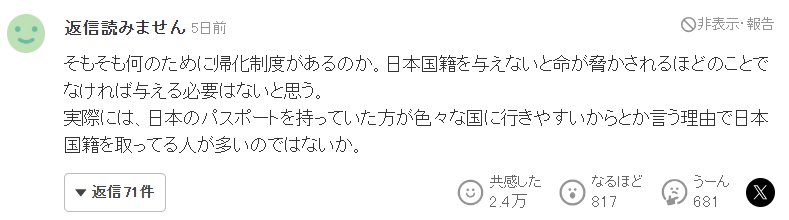 归化制度到底是为了什么?除非不给对方日本国籍会危及生命,否则我觉得没有必要轻易给予日本国籍。实际上,很多人选择日本国籍,是因为拿着日本护照去各种国家更方便吧?