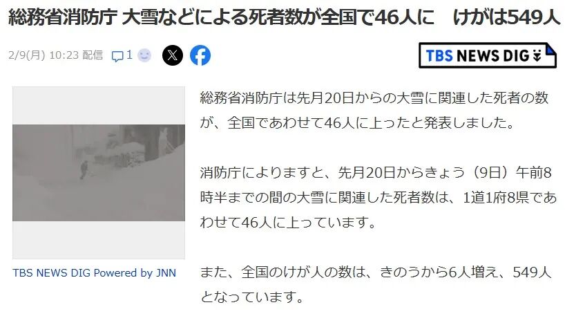 截至目前,这个冬天,日本因非正常的强降雪,已经造成至少46人死亡、549人受伤。其中有不少遇难者,疑似是在清理屋顶积雪时发生意外。看似是日常的除雪作业,但在积雪厚、气温低、地面结冰的情况下,风险被成倍放大。