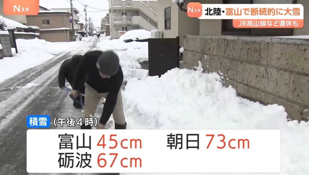 截至2月8日下午4点,富山市积雪大约450毫米,富山县东部的朝日町的积雪已经达到了730毫米,县西部的砺波市也接近700毫米。