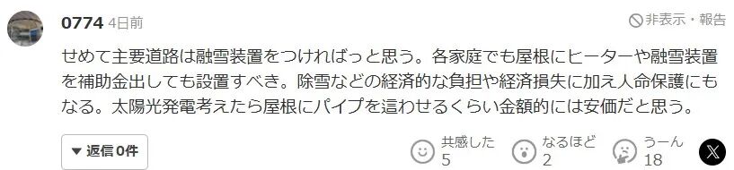 至少在主要道路上,真希望能够安装融雪装置。各个家庭的屋顶也应在补贴支持下,加装加热设备或融雪系统。这样不仅可以减轻清雪带来的经济负担和由此产生的经济损失,更重要的是能够保护生命安全。考虑到如今太阳能发电设备的普及,只是在屋顶铺设管道,从成本角度来看,我认为并不算太昂贵。