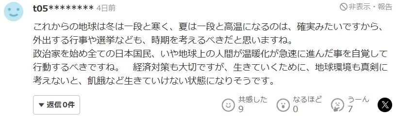 看起来,今后的地球将会呈现出这样的趋势:冬天会变得更加寒冷,夏天则会更加炎热……不仅是政治人物,所有日本民众,乃至生活在地球上的每一个人,都应当清醒认识到气候变暖正在加速,并据此改变自己的行为。当然,经济对策同样重要,但如果只是关注经济而忽视生存本身,就必须严肃对待地球环境问题……